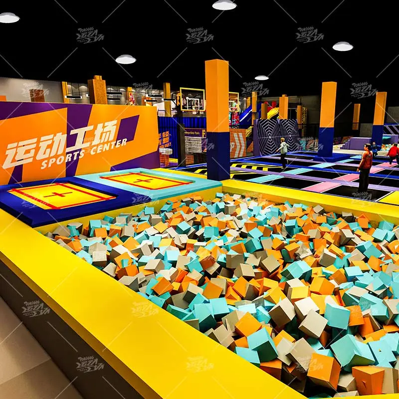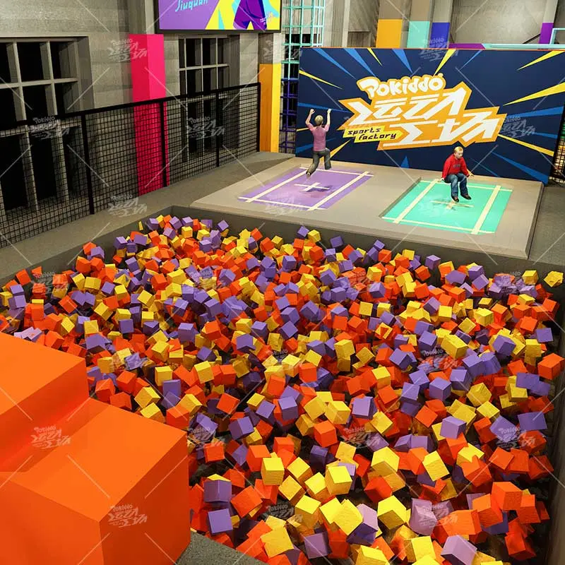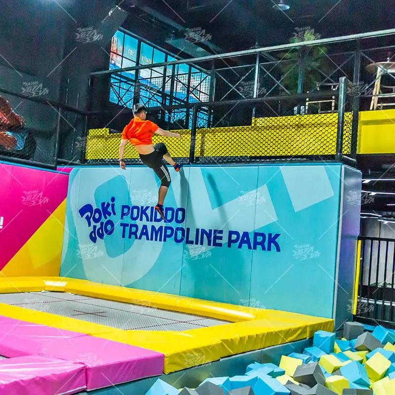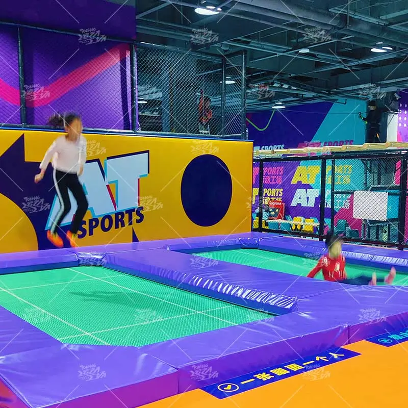 专业玩法,一般是接受过专业训练的蹦床教练来完成,他们可以完成各种炫酷的动作和高难度的表演。侧面有表演台,可以配合高台和墙面做走墙和踢墙等动作。
