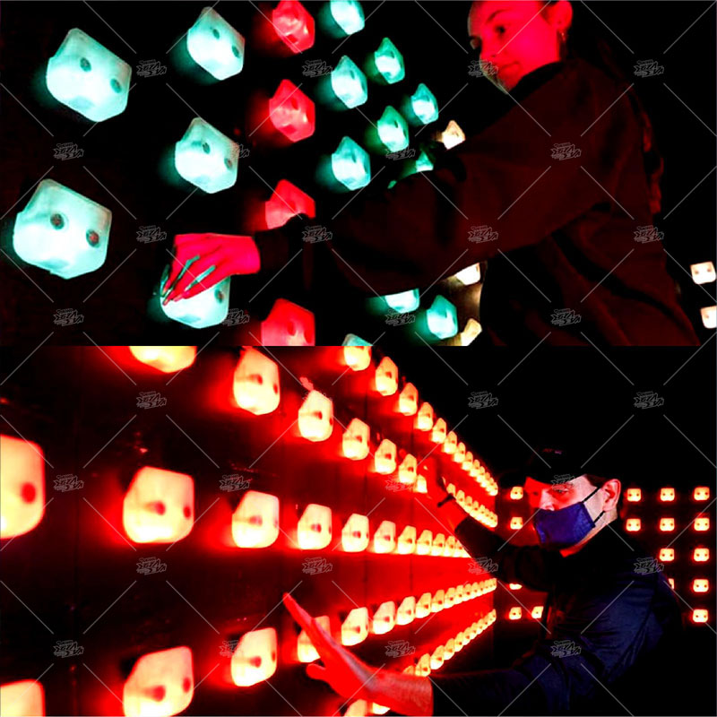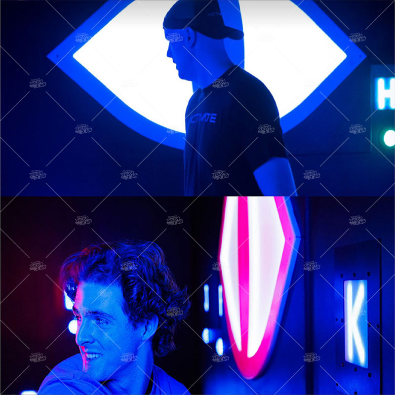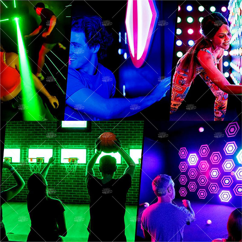方格大战游戏房间的进阶版,有两倍的方格,墙面上增加了20个点亮按钮,玩法升级,难度升级。玩家需要踩上或躲避发光的格子,以及按动墙上的按钮完成关卡,不一样颜色的格子代表不一样的功能:绿色格子为安全区、蓝色格子为得分区,踩到会增加分数、红色格子是危险区,踩到会扣除生命值!要在生命值归零之前获得足够分数,通关房间。需要玩家发挥团队协作,集中注意力,灵活躲避,通关房间。