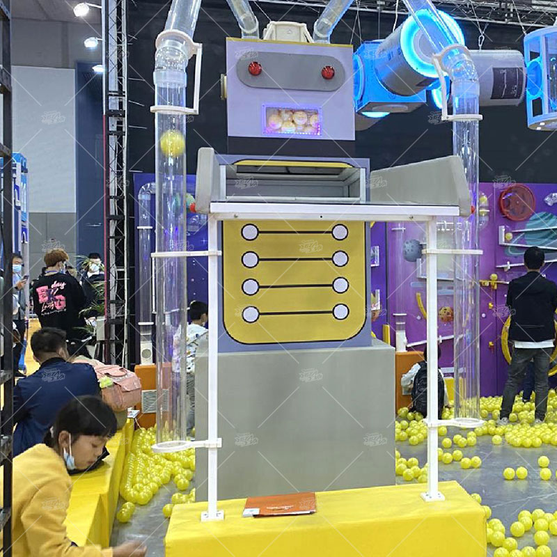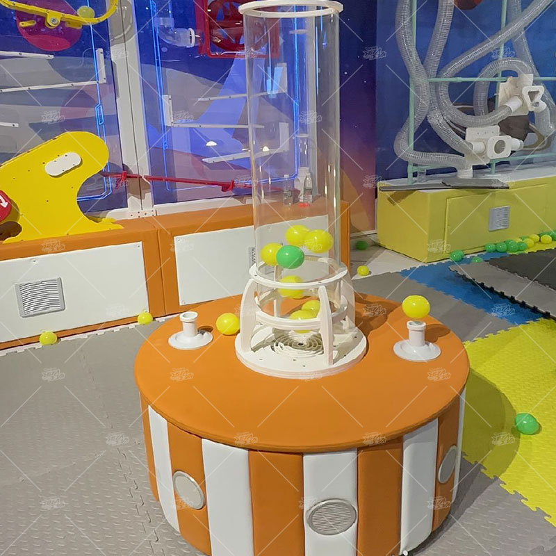 这是一款负压吸球设备,小朋友讲球放在进球口,小球会被吸到设备内部,当达到一定的球量时,感应打开设备,球将从天空掉下。将球放到入球口中顺着轨道在空中来回穿梭最后会掉落到时空机中,使用高度不低于三米。