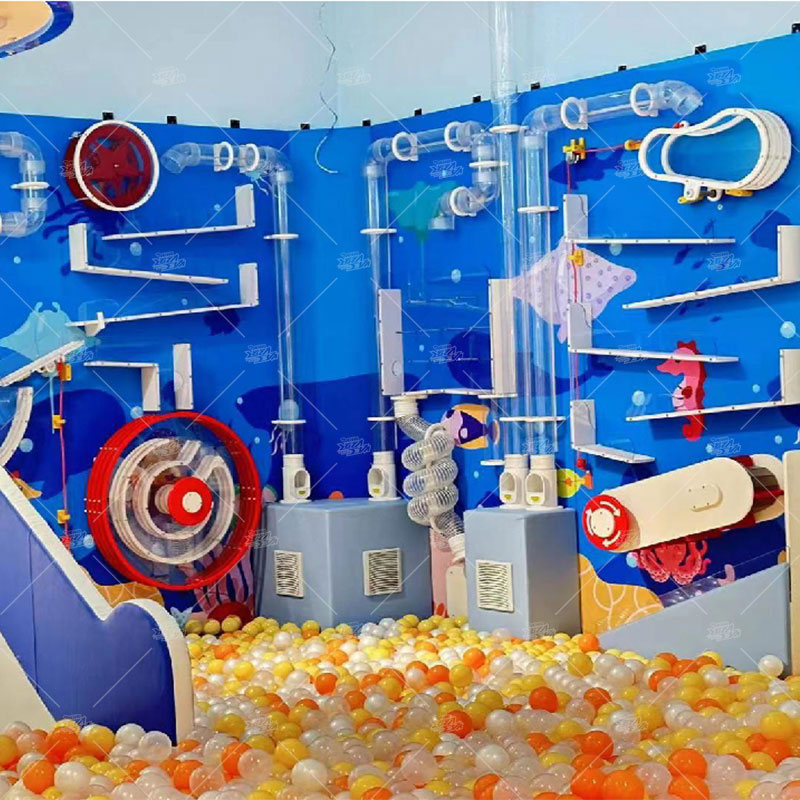 这是一组以宽1.2米为标准的系列透明球墙,每面球墙可以自由组展。将小球放入进球口中,负压将小球吸入洞中且沿管道运动,最终进入到各个动作模块中,小朋友在玩耍过程中体验各种运行和力学知识。