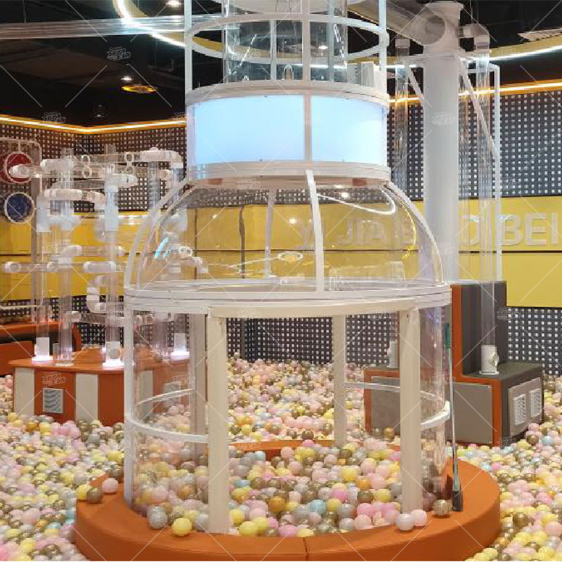 这是一款负压吸球设备,小朋友将球放在进球口,通过负压就可以将球吸到设备内部,当到达一定球量时触发感应,球从上空掉下,同时增加四面透明球墙。