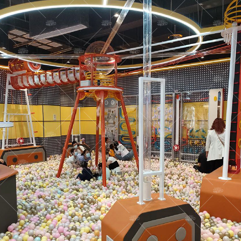 运用空气动力学理论,海洋球在各轨道内运行,通过不同的运行轨道最后落进球池,让小朋友眼随球动感受不一样的视觉旅行。