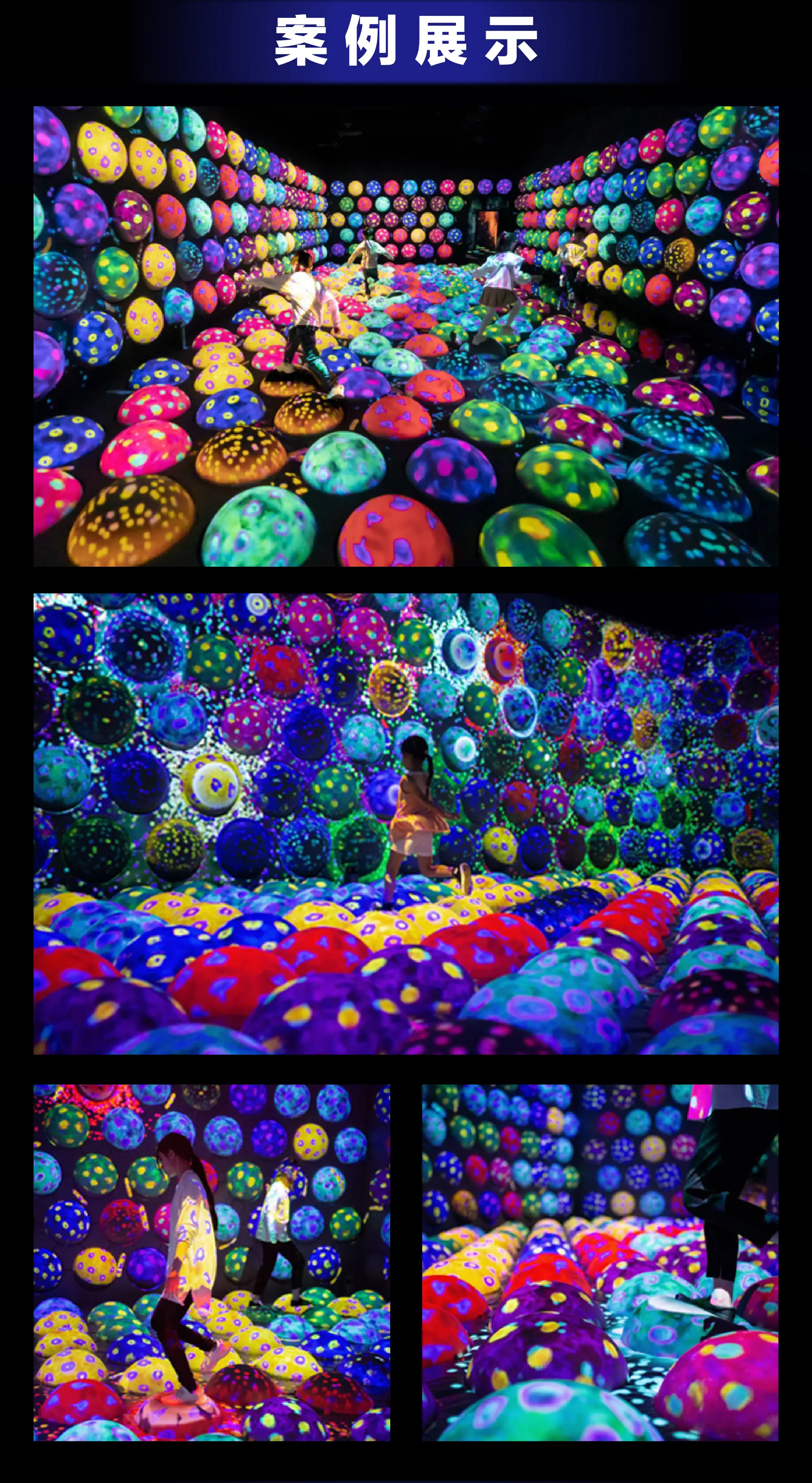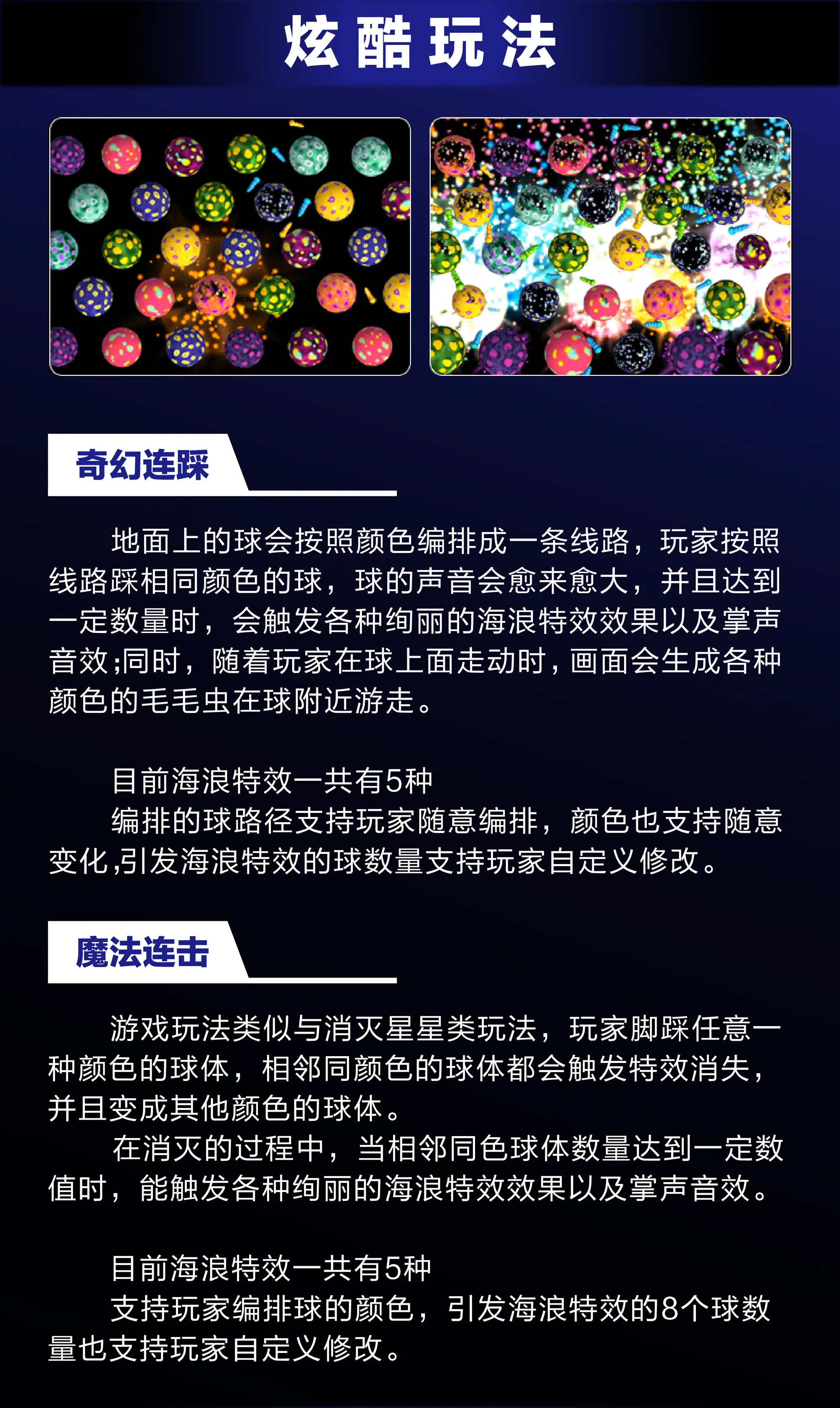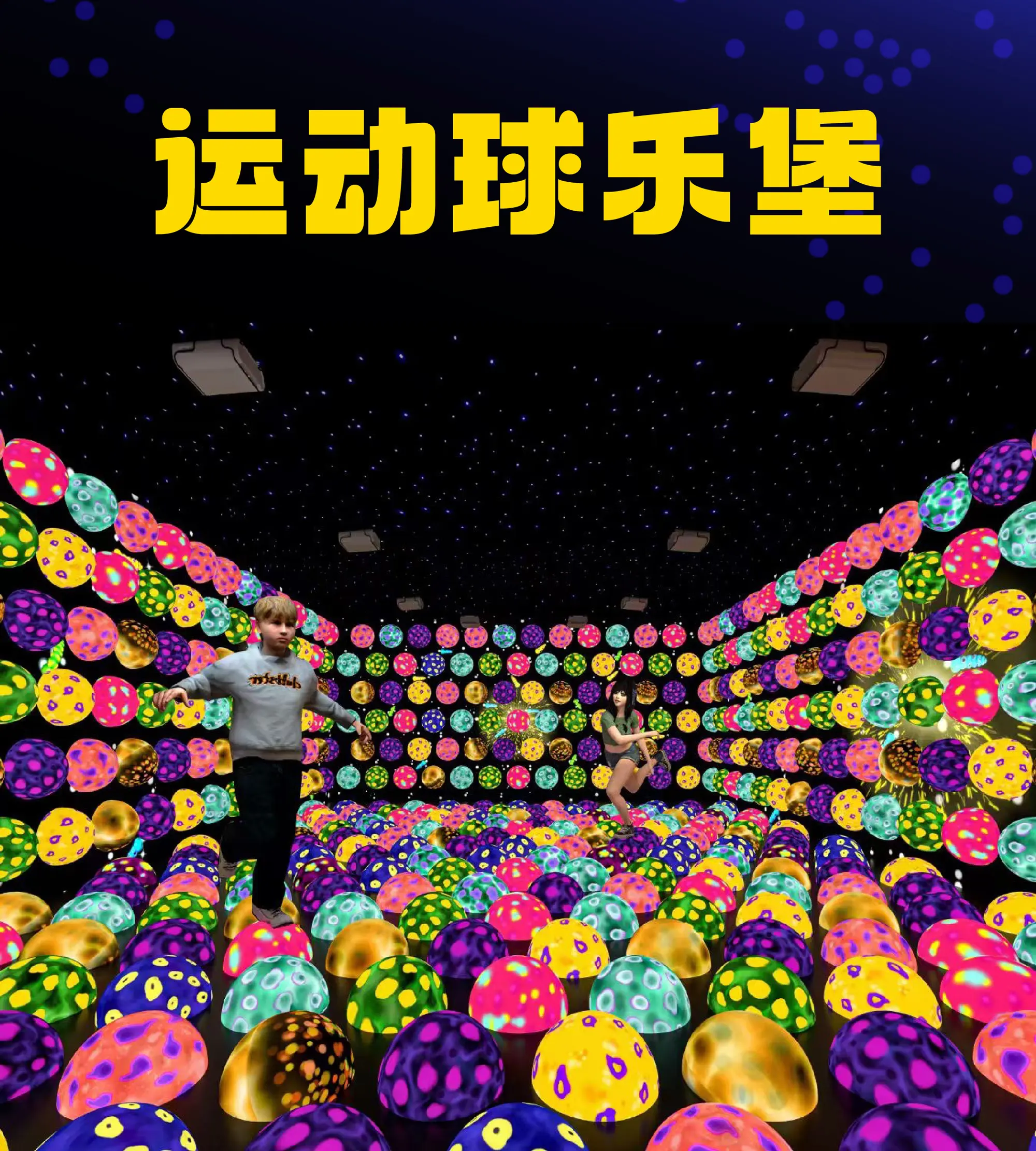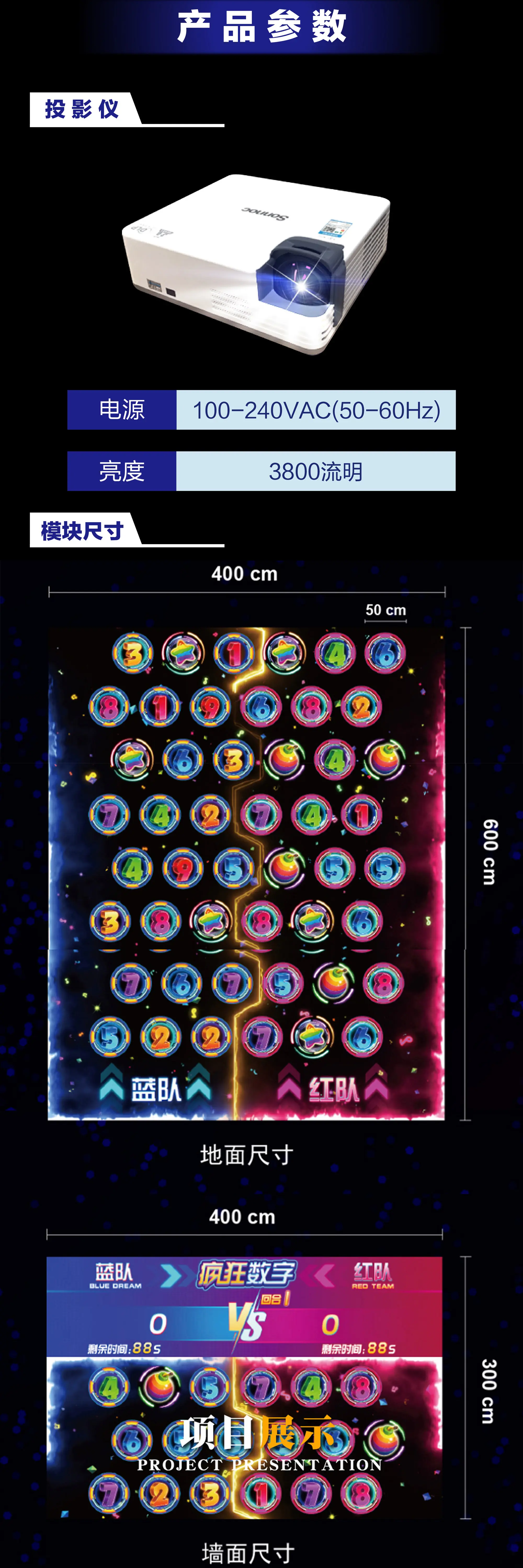产品简介:运动球乐堡是投影+感应方式的沉浸式互动游乐设备。借投影技术打造奇幻连踩(按色踩球,触发音效、海浪特效与动态毛毛虫 )、魔法连击(同色球消变,累计激活绚丽特效 )等玩法。精准互动、特效炫酷,防水防滑又易操控,适配商场、乐园等场景,助力引流,让玩家沉浸式运动解锁趣味,释放活力 。