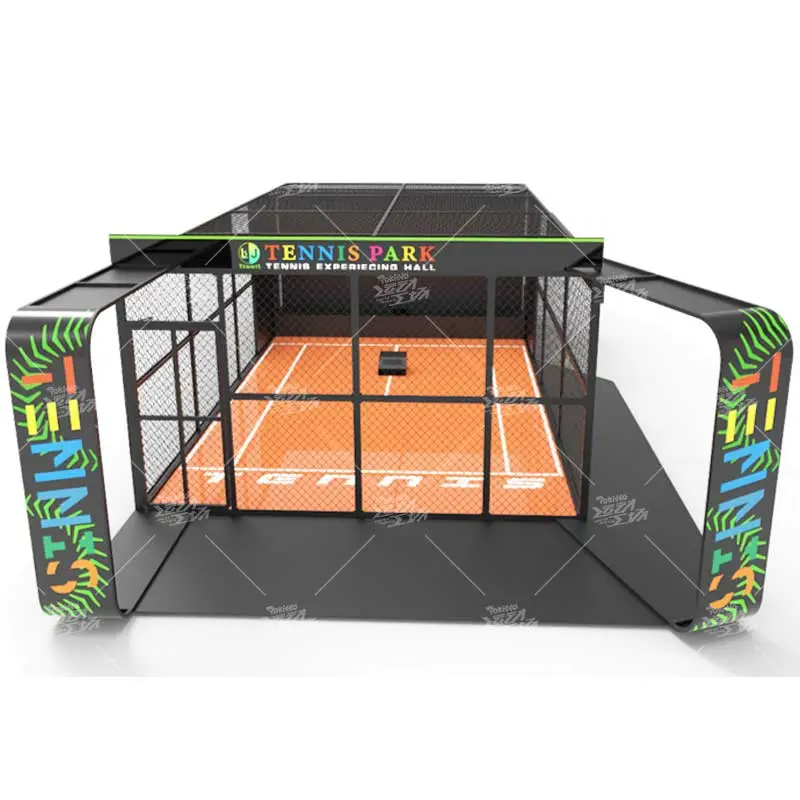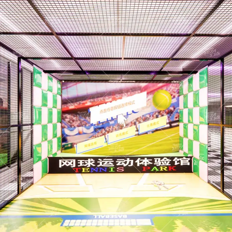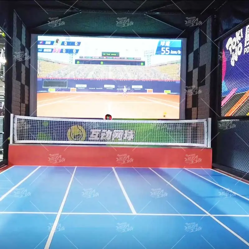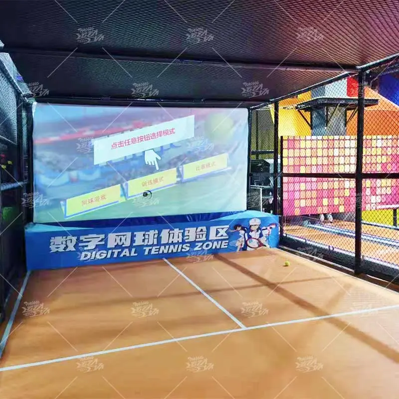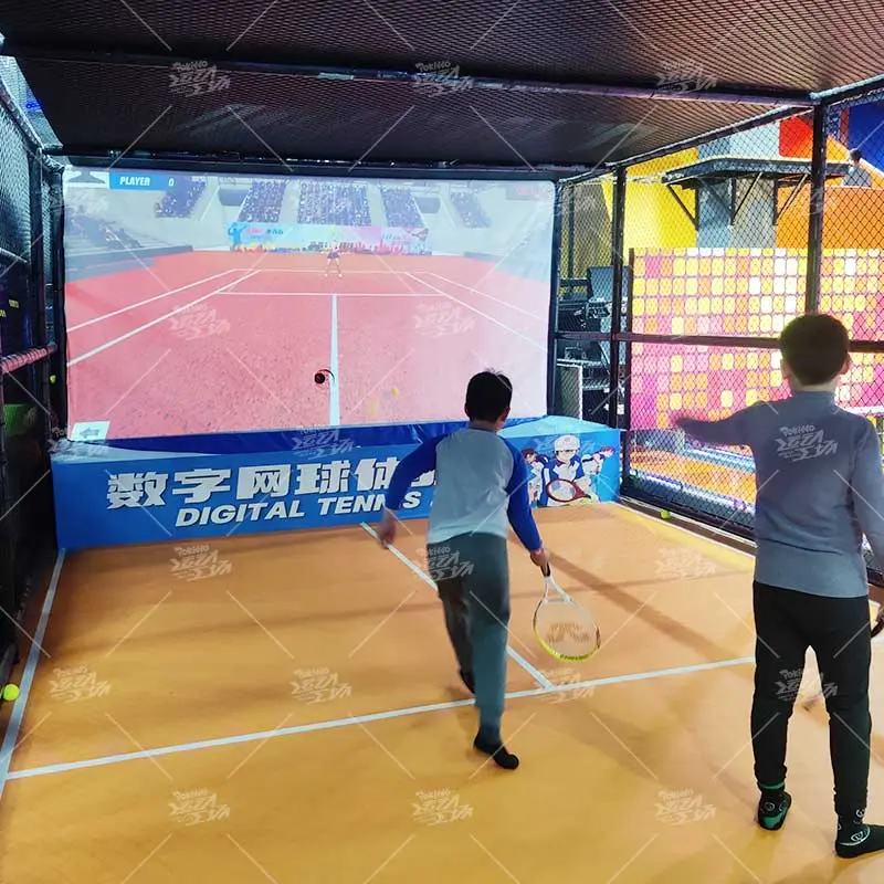 模拟互动网球,又称互动网球,是一款利用计算机数字仿真技术将室外真实的网球场设计到数字软件系统中,并通过投影机投影展现到用户面前的大屏暮上,真实模拟球手在室外打球的游乐产品。设备前方的高速相机感应器能瞬间测量网球的飞行速度、角度和旋转,由计算机信号处理后,将网球的弹道运动轨迹实时投射在大屏幕上,充分模拟真实场地的打球体验,用户在模拟训练过程中代入感非常强。